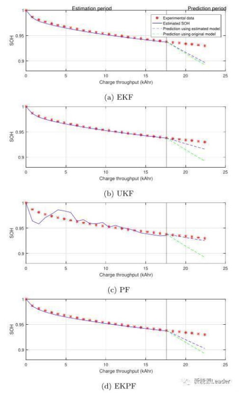 從上述分析可以得知,準確的估算模型的參數(shù),對于提高模型預(yù)測的準確程度具有十分重要的意義,為了能夠提高在線預(yù)測的準確度,Chin-Yao Chang利用了四種方法對模型參數(shù)進行在線估算: 1)擴展卡爾曼濾波EKF,2)無損卡爾曼濾波UKF,3)粒子濾波PF,4)擴展卡爾曼粒子濾波EKPF。利用四種方法對模型參數(shù)進行估算,然后利用這些參數(shù)對單體電池衰降進行預(yù)測的結(jié)果如下圖所示。從圖上可以看到,實驗分為兩個部分,第一部分是0到17.6kAh,這部分數(shù)據(jù)用于對模型參數(shù)的估算,第二部分是17.6到22.4kAh利用估算的參數(shù)對單體電池的衰降進行預(yù)測。從結(jié)果上來看,通過幾種方法的對模型的參數(shù)估算后,模型預(yù)測結(jié)果與實驗結(jié)果之間均方根要明顯小于原始模型的預(yù)測結(jié)果,這表明使用在線的模型參數(shù)估算可以顯著的提升模型預(yù)測的準確程度。