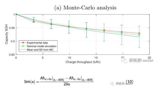 為了驗證該模型參數(shù)對預(yù)測結(jié)果的影響,Chin-Yao Chang隨機產(chǎn)生了100個與普通值偏離度在5%以內(nèi)的模型參數(shù),因此也就產(chǎn)生了100個模型,將該模型預(yù)測結(jié)果與實驗值和普通模型預(yù)測值進行了對比,實驗結(jié)果如下圖所示。從結(jié)果來看,在長期預(yù)測中由于模型參數(shù)微小誤差(5%以內(nèi))造成的誤差在電池循環(huán)過程中逐漸增大,導(dǎo)致模型預(yù)測失真。因此需要對模型參數(shù)進行靈敏度分析,靈敏度分析是采用了數(shù)字擾動方法進行的,如下式所示,式中a為衰降模型參數(shù),a為擾動,Sen為靈敏度度量。