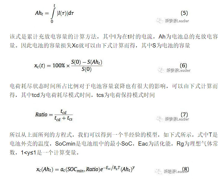 在開始介紹Chin-YaoChang開發(fā)的電池組衰降模型之前,我們首先對現(xiàn)有的電池衰降模型進行一個簡單的總結(jié)。首先對于電池來說,電池衰降主要會造成電池的容量下降、內(nèi)阻升高,因此對于單體電池的衰降我們主要關(guān)注的是兩個參數(shù)Xc(電池的容量衰降比例)和Xr(電池的內(nèi)阻升高比例),這兩個參數(shù)可以利用下式計算得到