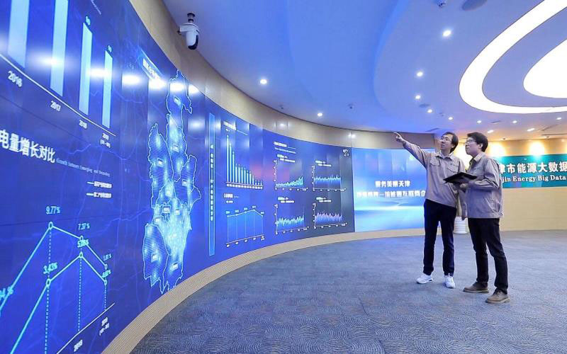 國網(wǎng)天津電力工作人員正在監(jiān)測檢查能源大數(shù)據(jù)中心數(shù)據(jù)。