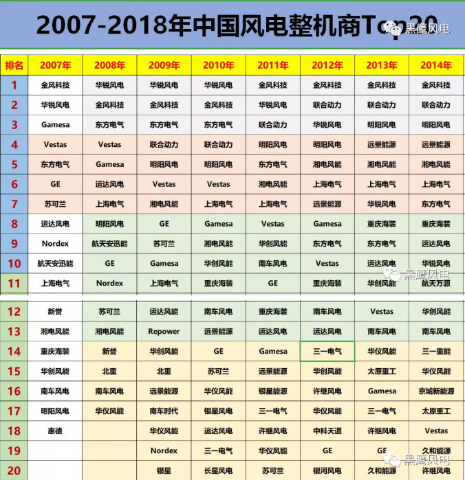 要跨越十五年的時(shí)間周期,理清整個(gè)中國風(fēng)電行業(yè)的競爭變局,細(xì)枝末節(jié)已極難說清。當(dāng)我們從歷年風(fēng)電整機(jī)商的具體排名變化,基本可以看到中國風(fēng)電市場競爭格局、趨勢的大變化,如下表: