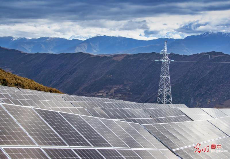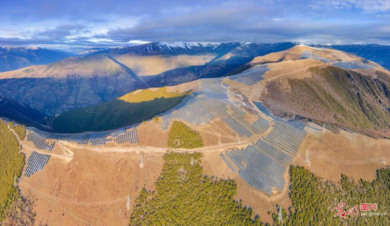 2019年11月4日,在位于海拔3900米的四川省阿壩州小金縣大壩口村,光伏發(fā)電廠占據(jù)了整個山脈,巍峨壯觀。(劉國興攝/光明圖片)