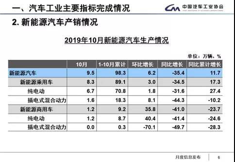 2019年1-10月,新能源汽車產(chǎn)銷累計(jì)分別完成98.3萬(wàn)輛和94.7萬(wàn)輛,比上年同期分別增長(zhǎng)11.7%和10.1%。