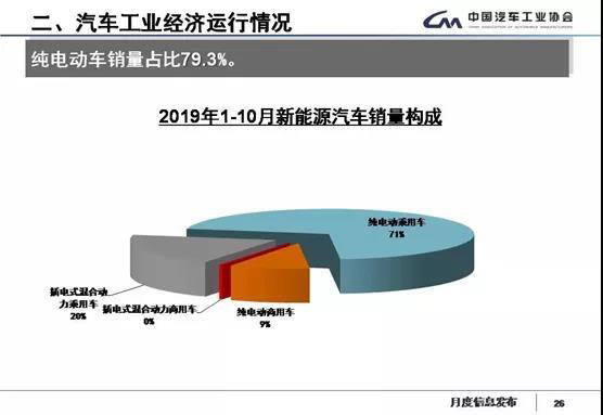 在1-10月新能源汽車銷量構(gòu)成方面,純電動(dòng)乘用車占總銷量的71%,插電式混合動(dòng)力乘用車占總銷量20%,純電動(dòng)商用車占總銷量9%。