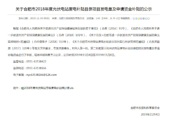 中國儲(chǔ)能網(wǎng)訊:11月4日,合肥省發(fā)改委發(fā)布關(guān)于合肥市2018年度光伏電站度電補(bǔ)貼目錄項(xiàng)目發(fā)電量及申請(qǐng)資金補(bǔ)貼的公示,由市發(fā)改委牽頭,對(duì)列入第一批、第二批和第三批光伏電站度電補(bǔ)貼目錄的項(xiàng)目發(fā)電量及申請(qǐng)補(bǔ)貼資金進(jìn)行了審核,現(xiàn)將審核結(jié)果予以公示,公示時(shí)間2019年11月4日至2019年11月8日。據(jù)公告顯示光伏補(bǔ)貼共計(jì)4.38億。