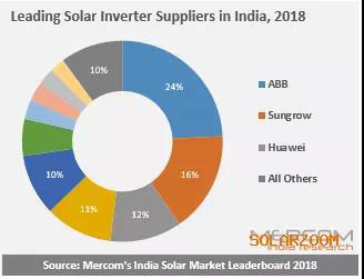 2019年6月,印度Mercom發(fā)布的印度2018年逆變器市場領(lǐng)導(dǎo)品牌榜單,Mercom稱,印度共有35家活躍的逆變器玩家,ABB以24%的市場份額占據(jù)排行榜首位,其次是陽光電源和華為,三者共計占領(lǐng)了印度市場52%,超過5GW的市場份額,前十大逆變器供應(yīng)商則占據(jù)了超過94%的市場供應(yīng),其余6%由其他供應(yīng)商共享。