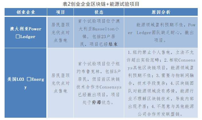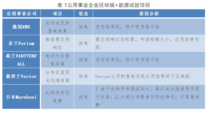 目前,國外已有一些公用事業(yè)企業(yè)開始了能源區(qū)塊鏈的試驗(yàn)項(xiàng)目(如表1所示),這些試驗(yàn)項(xiàng)目均已結(jié)束。綜合分析,有如下原因:1.由于區(qū)塊鏈本身的交易特性,導(dǎo)致支付效率低,用戶使用感不佳;2.所涉足項(xiàng)目的市場需求度不夠;3.已有的中心化售電系統(tǒng)綜合性能好過區(qū)塊鏈;4.比特幣市值不穩(wěn)定,無法成為網(wǎng)絡(luò)流通貨幣。