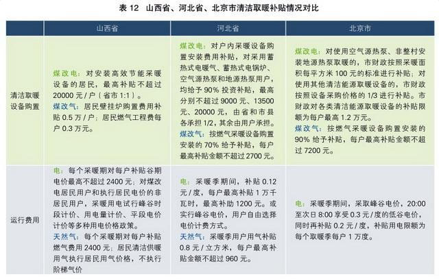 山西省、河北省、北京市清潔取暖補(bǔ)貼情況對(duì)比。資料來(lái)源:北方典型地區(qū)農(nóng)村居民冬季取暖研究報(bào)告