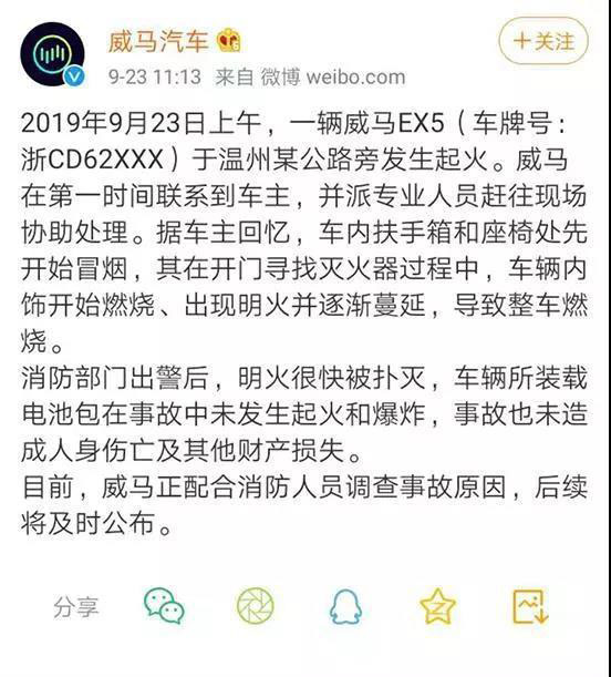 今日上午11點(diǎn),威馬汽車(chē)官方微博發(fā)布信息稱,2019年9月23日上午,一輛威馬EX5(車(chē)牌號(hào):浙CD62XXX)于溫州某公路旁發(fā)生起火。這是繼去年8月以來(lái),威馬EX5發(fā)生的第二次起火事故。