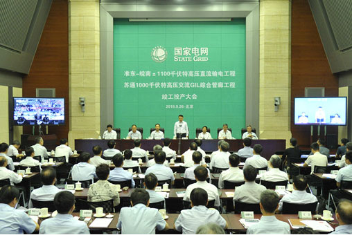 當日,準東—皖南±1100千伏特高壓直流輸電工程、蘇通1000千伏特高壓交流GIL綜合管廊工程竣工投產(chǎn)大會在京召開。會議深入學習貫徹習近平新時代中國特色社會主義思想,落實習近平總書記“四個革命、一個合作”能源安全新戰(zhàn)略,加快建設“三型兩網(wǎng)、世界一流”企業(yè),為實現(xiàn)“兩個一百年”奮斗目標貢獻力量。
