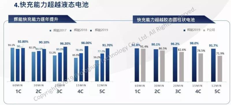 根據(jù)輝能此前提供的數(shù)據(jù)來(lái)看,2019年能實(shí)現(xiàn)5C倍率12分鐘充電91.70%。