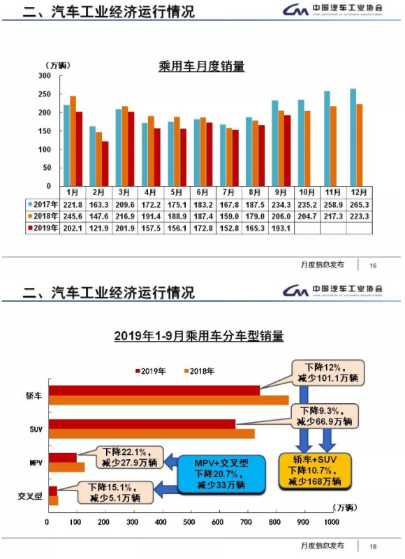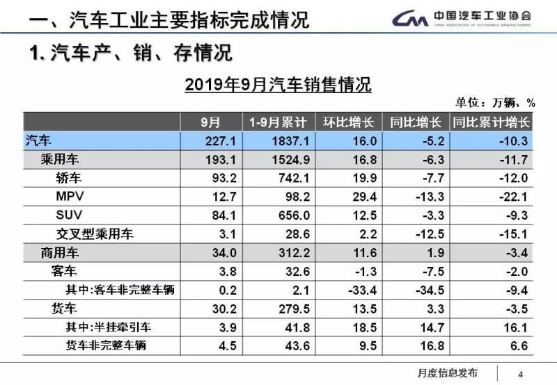 盡管降幅收窄,但這一降幅仍沒達到中汽協(xié)的預(yù)期,中汽協(xié)秘書長助理陳士華表示,從今年9月產(chǎn)銷數(shù)據(jù)完成情況看,與上月相比,呈現(xiàn)了明顯回升,行業(yè)銷量同比降幅也比上月有所收窄,但降幅依然較大,延續(xù)了去年7月份以來的下降態(tài)勢,我國汽車產(chǎn)銷量已連續(xù)15個月同比下降,其中新能源汽車也連續(xù)3個月下降,消費動能仍處于不足狀態(tài)。從乘用車車型看,本月所有車型同比均呈現(xiàn)下降,企業(yè)面臨的壓力沒有有效改善;商用車相對較好,本月產(chǎn)銷均呈現(xiàn)正增長。三季度,在一系列穩(wěn)就業(yè)、穩(wěn)金融、穩(wěn)外貿(mào)、穩(wěn)外資、穩(wěn)投資、穩(wěn)預(yù)期的政策作用下,汽車產(chǎn)銷降幅出現(xiàn)了收窄。