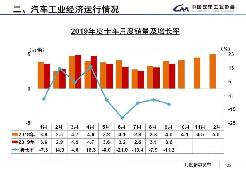 值得關(guān)注的是,1-9月,皮卡車產(chǎn)銷分別完成32萬輛和32.1萬輛,產(chǎn)銷量比上年同期分別下降6.4%和4.9%,降幅大于貨車整體。