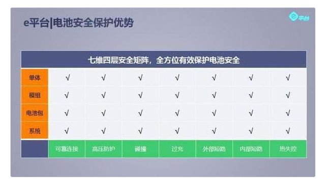 第四層,是模組級保護。通過采用高強度的鋁型材的模組設(shè)計使電池模組的強度增加了近35%,同時在電芯與電芯之間、模組與PACK之間設(shè)置隔熱緩沖區(qū),當車輛受到擠壓時,盡可能在一定程度上確保電芯不至于受到擠壓,保證電芯使用的安全性。