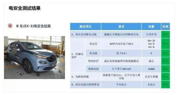 在實驗中,等紅燈的北汽新能源EX3被后車以50km/h時速追尾,隨后又被正常通過綠燈的車輛以50km/h時速撞擊側(cè)面。在后、側(cè)兩次強大的碰撞下,北汽新能源EX3的A柱、B柱,門梁沒有出現(xiàn)變形,駕駛艙保持了良好整體性,碰撞中車門沒有被撞開,碰撞后車門也能正常打開。在測試結(jié)束后公布的數(shù)據(jù)顯示,北汽新能源的電安全測試結(jié)果全部合格。