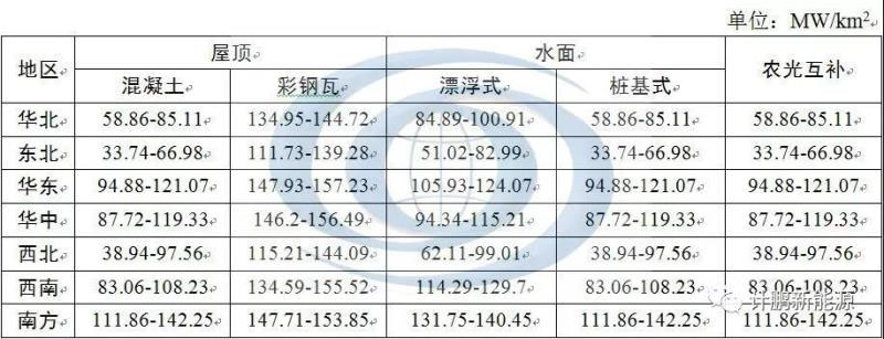 根據(jù)上表總結,屋頂混凝土式光伏、水面樁基式光伏、農(nóng)光互補式光伏按33.74-142.25MW/km2容量規(guī)劃,其中三北地區(qū)單位面積下可布置容量相比較小,分析其原因由于三北地區(qū)緯度較高,最佳光照傾角較大,使組件陰影面積擴大,故單位面積內(nèi)的組件可布置容量較小。