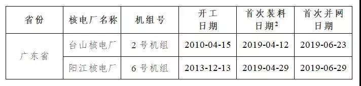 其中,臺(tái)山核電廠2號(hào)機(jī)組于2019年4月12日開(kāi)始進(jìn)行首次裝料,6月23日首次并網(wǎng),裝機(jī)容量為1750MWe;陽(yáng)江核電廠6號(hào)機(jī)組于2019年4月29日開(kāi)始進(jìn)行首次裝料,6月29日首次并網(wǎng),裝機(jī)容量為1086MWe。