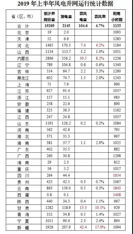 2019年上半年風(fēng)電并網(wǎng)運(yùn)行情
