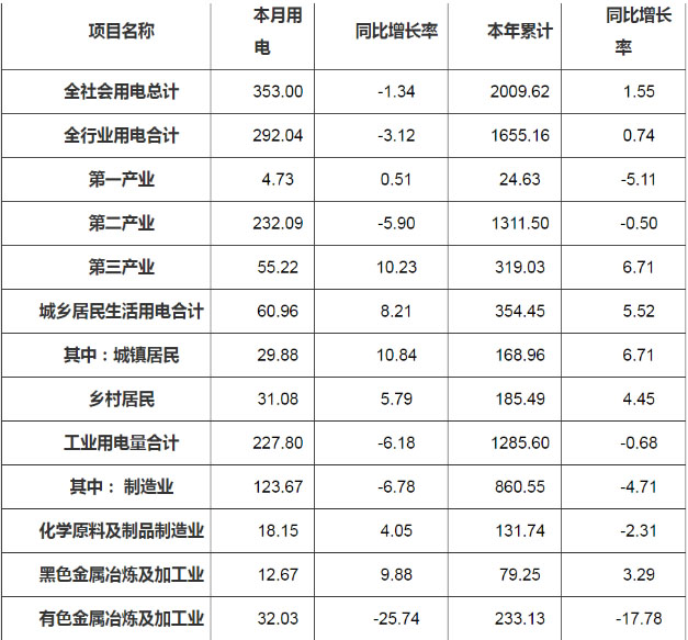 (一)全社會用電量情況。全省全社會用電量33.00億千瓦時,同比減少1.34%;累計用電量2009.62億千瓦時,同比增長1.55 %。