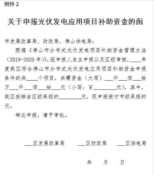 第十二條 區(qū)發(fā)展改革局會(huì)同區(qū)財(cái)政局、區(qū)供電局按照職責(zé)分工對(duì)申報(bào)材料進(jìn)行審核、確定申報(bào)資金后,向市發(fā)展改革局報(bào)送《關(guān)于申報(bào)光伏發(fā)電應(yīng)用項(xiàng)目補(bǔ)助資金的函》(見附件2)、《佛山市 區(qū)申報(bào)光伏發(fā)電應(yīng)用項(xiàng)目補(bǔ)助資金匯總表( 年)》(見附件3)、《佛山市分布式光伏發(fā)電應(yīng)用項(xiàng)目補(bǔ)助資金申報(bào)表( 年)》(見附件1)及項(xiàng)目原始申報(bào)材料。