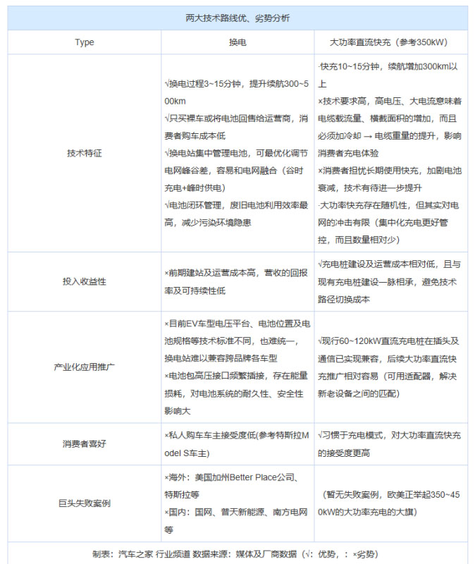 為了讓EV車使用便利性達(dá)到普通燃油車水平,緩解消費(fèi)者的里程、充電焦慮,眾車企一方面通過改善電池自身性能(能量密度等),提高整車?yán)m(xù)航里程;另一方面,從滿足消費(fèi)者的快速充電需求出發(fā),在車輛補(bǔ)電環(huán)節(jié)落腳,于是,換電和大功率直流充電這兩大技術(shù)路線便應(yīng)時而生。