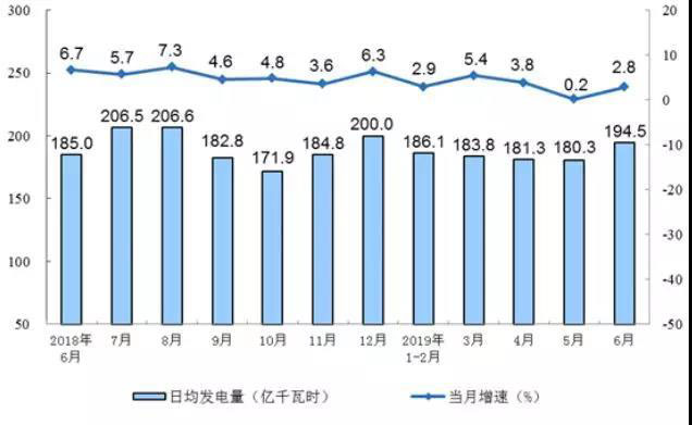 6月份,發(fā)電5834億千瓦時(shí),同比增長2.8%,增速比上月加快2.6個(gè)百分點(diǎn);日均發(fā)電194.5億千瓦時(shí),比上月增加14.2億千瓦時(shí)。上半年,發(fā)電3.4萬億千瓦時(shí),增長3.3%,增速較一季度放緩0.9個(gè)百分點(diǎn)。