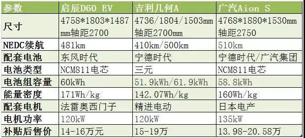 高工電動(dòng)車對(duì)比同樣定位在緊湊型純電動(dòng)轎車的吉利幾何A和廣汽Aion S發(fā)現(xiàn),啟辰D60 EV與Aion S均搭載寧德時(shí)代全新NCM 811電芯,能量密度進(jìn)一步提升,電池成本也將得到更好的控制。