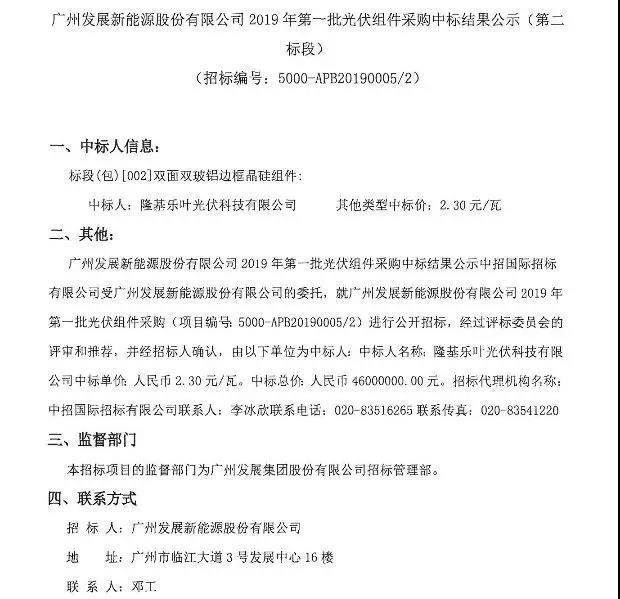 中國儲(chǔ)能網(wǎng)訊:近日,廣州發(fā)展新能源股份有限公司發(fā)布2019年第一批光伏組件采購中標(biāo)結(jié)果(第二標(biāo)段)。據(jù)公告顯示隆基樂葉以2.3元/W中標(biāo)360W雙面雙玻鋁邊框晶硅組件,總規(guī)模為20MW,共計(jì)4.6千萬元。