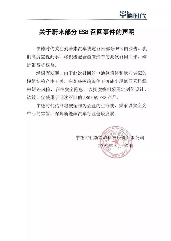 6月27日,國家市場監(jiān)督管理總局公告信息,上海蔚來汽車有限公司自即日起,主動召回部分搭載了2018年4月2日到2018年10月19日期間生產(chǎn)的動力電池包的蔚來ES8電動汽車,共計4803輛。