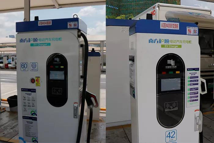 南方和順共有兩種不同功率充電樁,分別為42kW交流充電樁和60kW直流充電樁,通過我們實(shí)地觀察,南方和順以42kW交流充電樁為主。