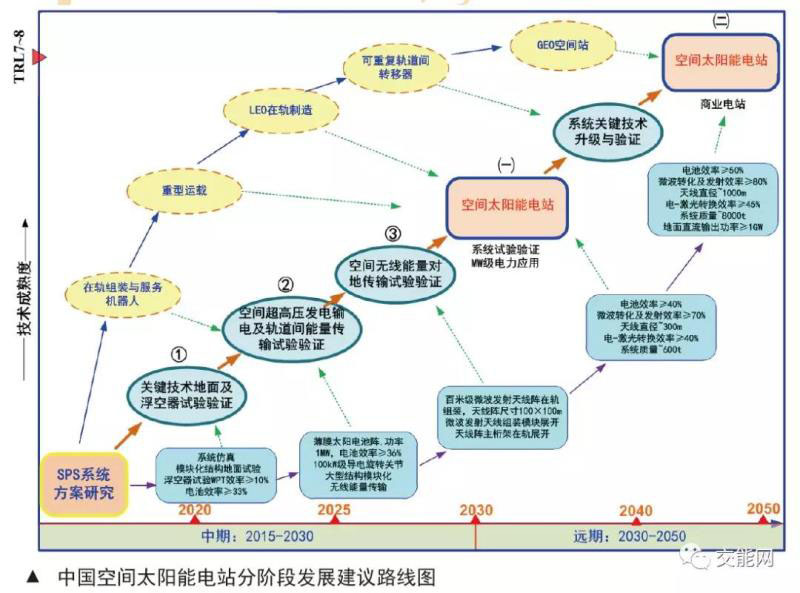 該項(xiàng)目以空間能源技術(shù)發(fā)展前沿為引導(dǎo),開展微波輸能、測控與通信等方向的基礎(chǔ)研究和應(yīng)用研究。計(jì)劃在2020年前投資2億進(jìn)行空間太陽能電站實(shí)驗(yàn)基地及研發(fā)平臺(tái)建設(shè),2025年左右實(shí)現(xiàn)中小規(guī)模平流層太陽能電站及并網(wǎng)發(fā)電,2025年后開展大規(guī)??臻g太陽能電站系統(tǒng)應(yīng)用工作。下一步將是在2030年開始建設(shè)兆瓦級(jí)空間太陽能試驗(yàn)電站。2050年后建設(shè)吉瓦級(jí)商業(yè)空間太陽能電站。中國有望成為世界首個(gè)建成有實(shí)用價(jià)值空間太陽能電站的國家。