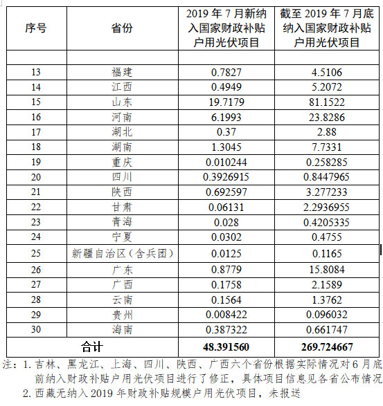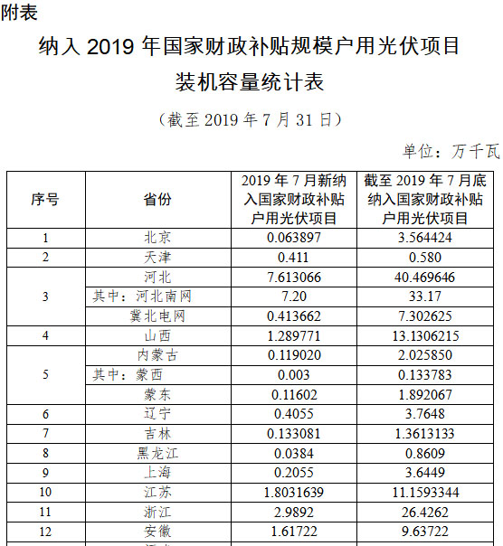 根據(jù)各省級能源主管部門、電網(wǎng)企業(yè)報送信息,經(jīng)國家可再生能源信息管理中心梳理統(tǒng)計,2019年7月新納入國家財政補貼規(guī)模戶用光伏項目總裝機容量為48.39萬千瓦。截至2019年7月底,全國累計納入2019年國家財政補貼規(guī)模戶用光伏項目裝機容量為269.72萬千瓦。詳細(xì)情況見附表。