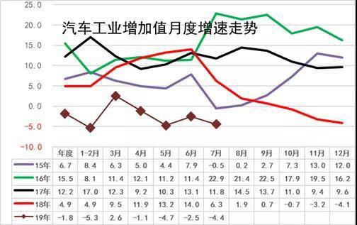 19年1-7月的汽車增加值-1.8%,仍處近期低位。18年增5%.。19年1-7月汽車業(yè)增加值是低于于制造業(yè)增加值平均水平,為制造業(yè)穩(wěn)增長貢獻(xiàn)不大。