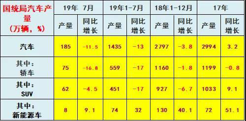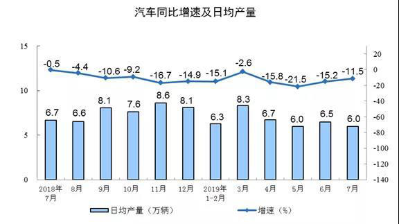 分產(chǎn)品看, 19年7月份汽車生產(chǎn)的日均汽車生產(chǎn)6.0萬臺,增長-12%。考慮到18年7月的6.7萬的較低增速,今年增速-15%的表現(xiàn)相對很差。