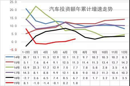 1-7月汽車投資應(yīng)該是不強(qiáng),但7月大幅改善。從1-6月的0.2%上升到19年1-7月的1.8%,上升幅度較大。6-7月走出負(fù)增長區(qū)間,體現(xiàn)行業(yè)的巨大拉升投資熱情。
