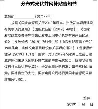 近日,已有山東的業(yè)主收到當(dāng)?shù)毓╇娋职l(fā)來(lái)的“分布式光伏并網(wǎng)補(bǔ)貼告知書(shū)”,明確2019年5月28日之前已建成并網(wǎng)但未納入國(guó)家補(bǔ)貼范圍的戶用光伏項(xiàng)目按照燃煤標(biāo)桿電價(jià)0.394元+國(guó)家補(bǔ)貼0.18元的標(biāo)準(zhǔn)納入國(guó)家補(bǔ)貼規(guī)模。