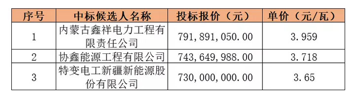 7月2日,中廣核庫布其二期200MW光伏治沙項(xiàng)目工程EPC總承包公示中標(biāo)候選人,內(nèi)蒙古鑫祥電力工程有限責(zé)任公司以總報(bào)價(jià)791,891,050.00元、單價(jià)3.959元/瓦位列第一中標(biāo)候選人。值得一提的是,內(nèi)蒙古鑫祥電力工程有限責(zé)任公司為三位中標(biāo)候選人中報(bào)價(jià)最高者,具體如下: