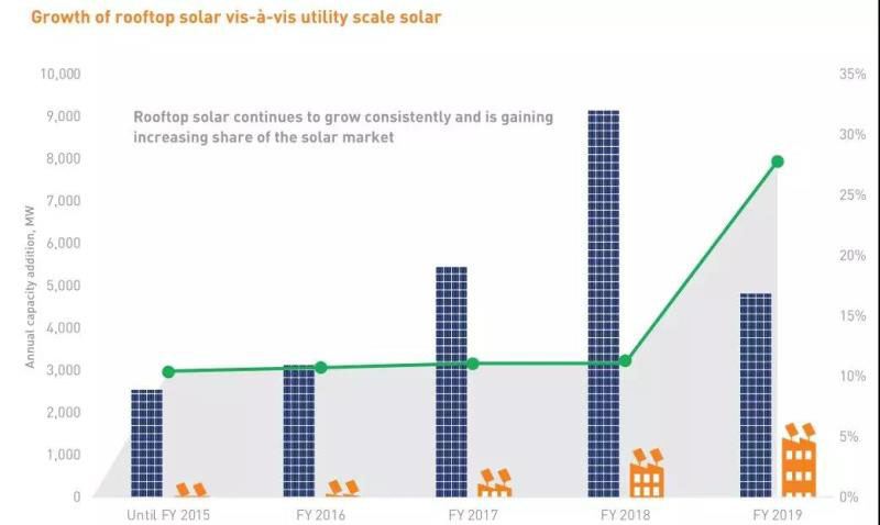 (屋頂與公用事業(yè)規(guī)模太陽(yáng)能增長(zhǎng),來(lái)源:BridgetoIndia)▲