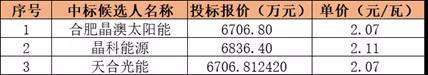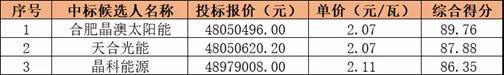 7月8日,廣西東盟經(jīng)開區(qū)科天水性分布式光伏發(fā)電項(xiàng)目晶體硅光伏組件采購公示中標(biāo)候選人,晶澳、天合、晶科依次為前三名候選人,具體如下: