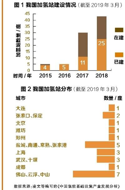 中國儲能網(wǎng)訊:自2017年以來,我國氫能產(chǎn)業(yè)呈現(xiàn)爆發(fā)式發(fā)展,現(xiàn)階段,我國的應(yīng)用市場主要以燃料電池大巴車與物流車為主,為了滿足車輛應(yīng)用示范,各地已開始大規(guī)模規(guī)劃并建設(shè)保障性加氫站。截至2019年3月,我國已投產(chǎn)加氫站數(shù)量達到 25座(包括兩座內(nèi)部整改站),較2017年增加14座(見圖1)。在已建成的加氫站中,固定式加氫站有11座,撬裝式加氫站有14座,此外,還有17座加氫站在建。加氫站分布主要集中在廣東、江蘇、上海、湖北、河北等地。