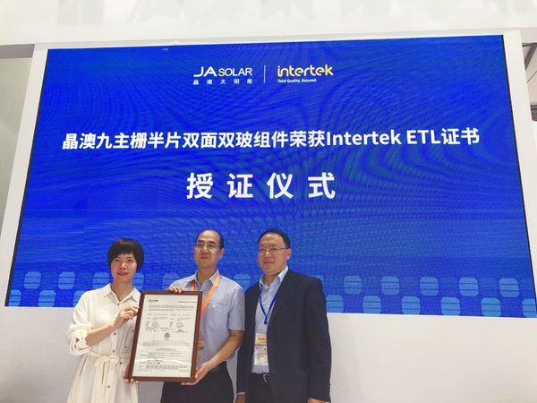 中國儲能網(wǎng)訊:6月4日,SNEC第十三屆(2019)國際太陽能光伏與智慧能源(上海)展覽會暨論壇開幕,全球領(lǐng)先的高性能光伏產(chǎn)品制造商之一晶澳太陽能有限公司(以下簡稱“晶澳太陽能”)所展出的九主柵半片雙面雙玻單晶組件獲得 Intertek天祥集團(以下簡稱“Intertek”)頒發(fā)的 UL61215 及 UL61730 標準的 ETL 證書。晶澳太陽能的常規(guī)雙面雙玻單晶組件早在今年2月便已經(jīng)獲得 ETL 美標新標證書,此次九主柵半片雙面雙玻單晶組件的獲證,更體現(xiàn)出晶澳太陽能領(lǐng)先的技術(shù)實力和可靠的產(chǎn)品質(zhì)量優(yōu)勢。授牌儀式在晶澳太陽能展臺隆重舉行,晶澳太陽能董事牛新偉博士、質(zhì)量部總監(jiān)黃淑玟女士、Intertek電子電氣事業(yè)部華東區(qū)銷售總監(jiān)李一峰先生等雙方代表出席了儀式。