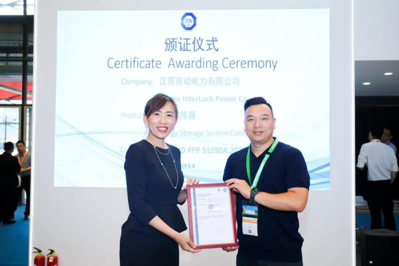 TüV南德大中華區(qū)工業(yè)產(chǎn)品服務部銷售總監(jiān)李蕊女士為江蘇連動電力的LD-EV-200系儲能系統(tǒng)專用連接器頒發(fā)TüV南德PPP 51090A:2018認證證書