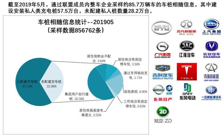 值得一提的是,根據(jù)聯(lián)盟數(shù)據(jù),截至2019年5月,通過聯(lián)盟內(nèi)成員整車企業(yè)采樣約85.7萬輛車的車樁相隨信息,其中未隨車配建充電設(shè)施28.2萬臺(tái),整體未配建率32.9%。集團(tuán)用戶自行建樁、居住地物業(yè)不配合、居住地沒有固定停車位這三個(gè)因素是未隨車配建充電設(shè)施的主要原因,占比達(dá)70.4%,其余原因占比為29.6%。