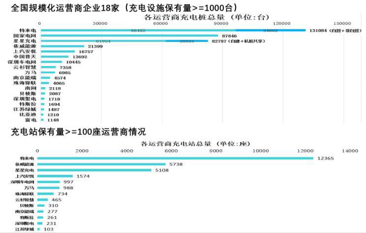 從運(yùn)營(yíng)商角度來看,集中度也較高,截止到2019年5月,全國(guó)充電運(yùn)營(yíng)企業(yè)所運(yùn)營(yíng)充電樁數(shù)量超過1萬臺(tái)的共有7家,分別為:特來電運(yùn)營(yíng)13.1萬臺(tái)、國(guó)網(wǎng)運(yùn)營(yíng)8.8萬臺(tái)、星星充電運(yùn)營(yíng)8.3萬臺(tái)、依威能源運(yùn)營(yíng)2.1萬臺(tái)、上汽安悅運(yùn)營(yíng)1.7萬臺(tái)、中國(guó)普天運(yùn)營(yíng)1.4萬臺(tái)、深圳車電網(wǎng)運(yùn)營(yíng)1.0萬臺(tái)。這7家運(yùn)營(yíng)商占總量的90.8%,其余的運(yùn)營(yíng)商占總量的9.2%。