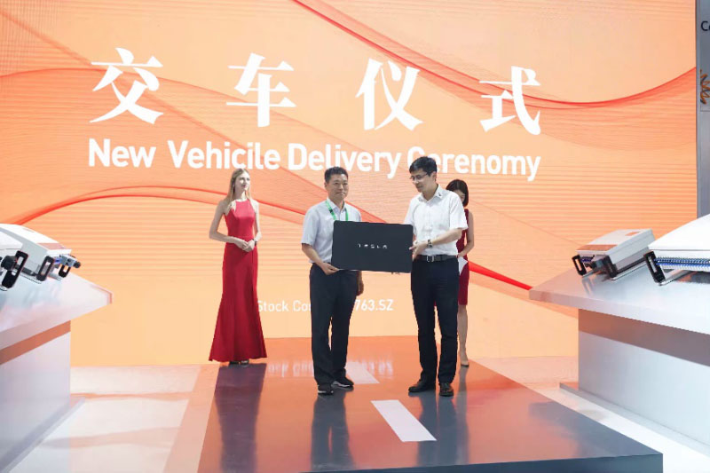 6月4日上午11點,錦浪科技于展位區(qū)舉行了第五代5G逆變器技術(shù)平臺發(fā)布會及特斯拉交車儀式。