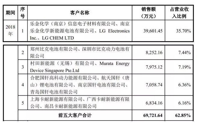 韓國三星、韓國LG、日本村田和寧德新能源、比亞迪、國軒高科、比克動(dòng)力、天津力神、卡耐新能源等國內(nèi)外知名鋰電池制造商均是座上賓。其中,2018年度前五大客戶占比達(dá)到63%,詳見下表: