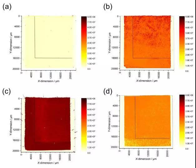 圖5 負(fù)極極片鋰濃度分布:(a)未循環(huán),(b)第6次循環(huán)后放電狀態(tài)(無(wú)自放電),(c)第7次循環(huán)后放電狀態(tài)(自放電實(shí)驗(yàn)后),(d)第20次循環(huán)后放電狀態(tài)(恒壓放電實(shí)驗(yàn)后)