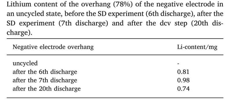 以上過(guò)程伴隨著鋰離子的自擴(kuò)散,如圖4所示,充電后自放電靜置實(shí)驗(yàn),負(fù)極極片鋰離子發(fā)生自擴(kuò)散,在負(fù)極極片整體區(qū)域內(nèi)比較均勻的分布,其中也包括overhang區(qū)域,部分鋰離子自與正極重疊區(qū)域擴(kuò)散到了overhang區(qū)域,放電后overhang區(qū)域的鋰離子殘留在負(fù)極,使放電容量降低了。后續(xù)的循環(huán)過(guò)程中又有部分overhang區(qū)域殘留鋰離子擴(kuò)散到了與正極重疊區(qū)域發(fā)揮作用,容量恢復(fù),圖3所示,第8次循環(huán)后放電容量高于充電容量。