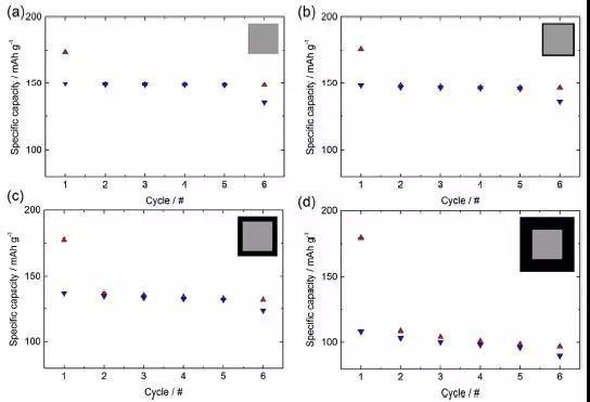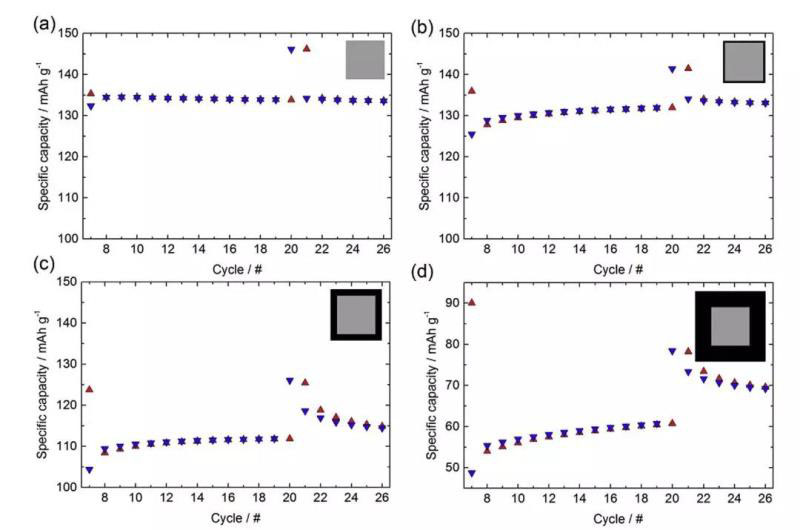 為了加速overhang區(qū)域的殘留鋰離子擴(kuò)散到重疊區(qū)域發(fā)揮作用,在20次循環(huán)放電后再加一個(gè)小電流恒壓放電,在電場(chǎng)作用下,overhang區(qū)域的鋰離子加速擴(kuò)散進(jìn)入重疊區(qū)域,圖3所示,之后容量恢復(fù)更明顯,而且overhang區(qū)域面積越大,容量恢復(fù)越多。