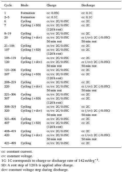 圖1是不同的Overhang設(shè)計(jì),然后按照表1程序?qū)σ陨蠋追N電池做循環(huán)測(cè)試,然后對(duì)不同階段的極片做ICP測(cè)試,研究負(fù)極極片鋰濃度的分布。表1中SD表示CCCV充電后靜置120h做電池自放電實(shí)驗(yàn),dcv表示恒流放電之后再做0.05C恒壓放電測(cè)試。